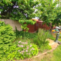 A 975 m²-es, virágzó kert nemcsak dísz, hanem egy élő, lélegző tér: gyümölcsfák, friss pázsit, madárdal és esti fények, amikor a teraszon kortyolod a bort, és hallgatod, ahogy a nap még egyszer visszanéz rád a háztetőről.